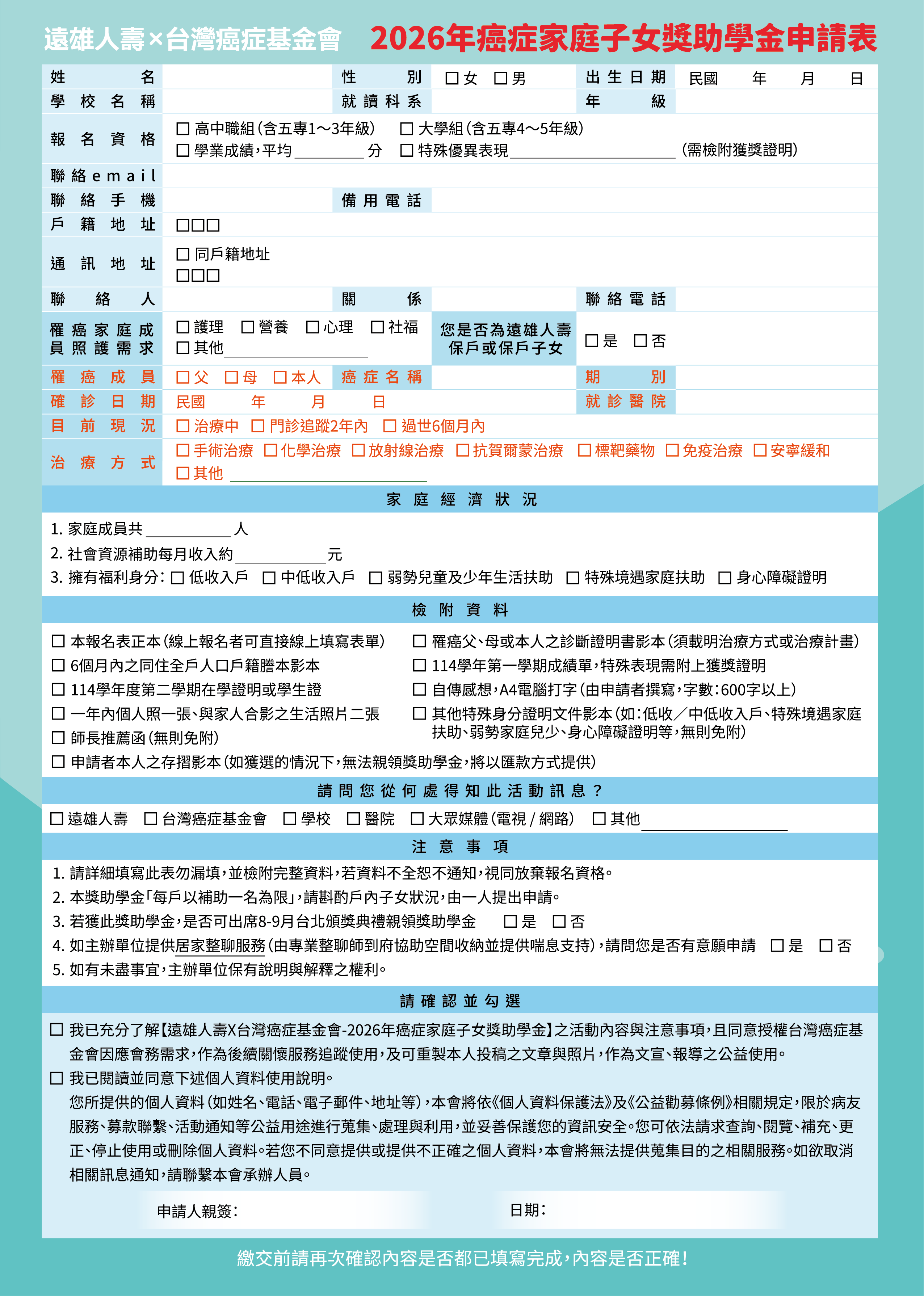校園公告 公告主旨 「2026台灣癌症基金會x遠雄人壽-癌症家庭子女獎助學金」申請事宜 發佈日期 2026 年 4 月 27 日 發佈單位 註冊組 公告類別 獎助學金 公告等級 無 點閱次數 11 公告內容 「2026台灣癌症基金會x遠雄人壽-癌症家庭子女獎助學金」申請事宜 相關附件 「2026台灣癌症基金會x遠雄人壽-癌症家庭子女獎助學金」申請事宜 「2026台灣癌症基金會x遠雄人壽-癌症家庭子女獎助學金」申請事宜 檔案名稱檔案大小檔案格式下載「2026台灣癌症基金會x遠雄人壽-癌症家庭子女獎助學金」申請事宜.pdf154.25 KB新視窗開啟檔案「2026台灣癌症基金會x遠雄人壽-癌症家庭子女獎助學金」申請事宜1.png847.06 KB新視窗開啟檔案 「2026台灣癌症基金會x遠雄人壽-癌症家庭子女獎助學金」申請事宜.pdf「2026台灣癌症基金會x遠雄人壽-癌症家庭子女獎助學金」申請事宜1.png 「2026台灣癌症基金會x遠雄人壽-癌症家庭子女獎助學金」申請事宜2 「2026台灣癌症基金會x遠雄人壽-癌症家庭子女獎助學金」申請事宜2 檔案名稱檔案大小檔案格式下載「2026台灣癌症基金會x遠雄人壽-癌症家庭子女獎助學金」申請事宜2.pdf355.57 KB新視窗開啟檔案「2026台灣癌症基金會x遠雄人壽-癌症家庭子女獎助學金」申請事宜3.png753.32 KB新視窗開啟檔案 「2026台灣癌症基金會x遠雄人壽-癌症家庭子女獎助學金」申請事宜2.pdf「2026台灣癌症基金會x遠雄人壽-癌症家庭子女獎助學金」申請事宜3.png 【2026-04-27】「教育部國民及學前教育署特殊教育中央輔導團教育部主管高級中等 ... 【2026-04-26】普門中學115年4月26日(日)返校車表