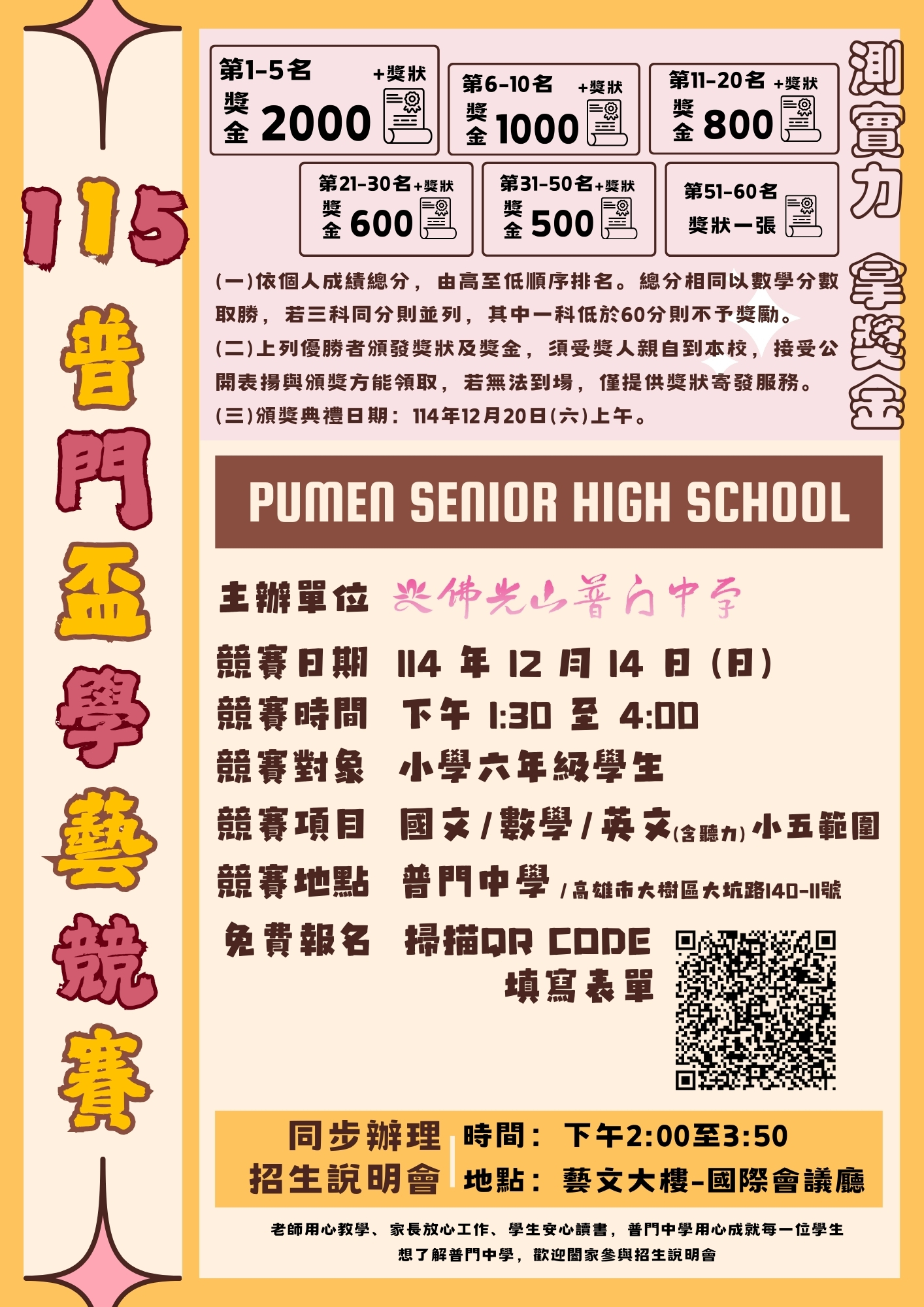 公告內容 | 115屆普門盃學藝競賽,活動報名開始! 競賽日期:114年12月14日(週日) 競賽時間:下午1:30至4:00 競賽對象:國小六年級學生 競賽項目:國語/數學/英文 國小五年級範圍 競賽地點:普門中學(高雄市大樹區大坑路140-11號) 競賽獎金:詳細請見以下附件 免費報名:報名網址如下附件